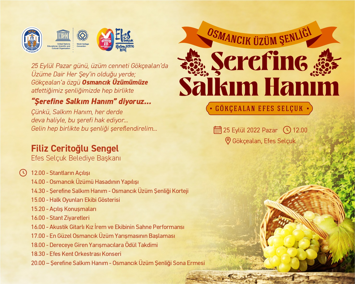 25 Eylül Pazar günü üzüm cenneti Gökçealan’da düzenlenecek olan “Şerefine Salkım Hanım Osmancık Üzüm Şenliği” festivaller kenti Efes Selçuk’un, kentin tarımsal değerlerini tanıtmak ve üreticiye katkı sunmak amacıyla düzenlenen festivalleri arasında yer alıyor.