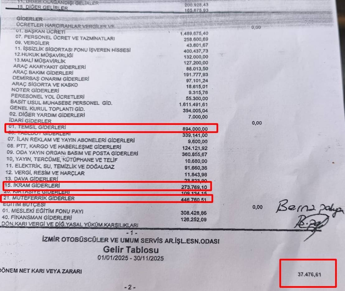 İzmir Otobüsçüler ve Servis Araçları Odası'nın, iki yılda milyonlar harcayıp yılllık kazancını 37 Bin TL olarak açıklaması seçime giden odanın üyeleri arasında ciddi tartışma konusu oldu. İzmir’de yeni yıla girilirken iyice hız kazanan olan esnaf odalarında seçim atmosferi, seçim tansiyonunun iyice yükselmesine de doğal olarak neden oldu. Seçime gidecek olan İzmir Otobüsçüler ve Servis Araçları Odası'nın yıllık faaliyet bilançosu ise seçimden daha çok konuşulan ve tartışılan konu oldu.İzmir Otobüsçüler ve Servis Araçları Odası'nın Başkanı Erdem Mert’in başkanlığında iki yıllık faaliyet raporunda yer aldığı iddia edilen bilançoda temsil giderinin 894 Bin TL, ikram giderinin 273 Bin TL, oda yayın ve basın giderlerinin 360 Bin TL, başkan giderlerinin 1 Milyon 489 Bin 675.40 TL ve hesapta olmayan giderlerin 446 Bin 760 TL gösterilmesinden sonra iki yıl sonunda odanın kasasında 37 bin TL olduğunun belirtilmesi oda üyelerinin tepkisinin de çekti.Odanın varlığının kendilerine yarardan çok maddi anlamda zarar verdiğini iddia eden üyeler, “İki yılda gidenler üyelerin verdiği aidat paraları. İki yıl sonra kasada olan 37 bin TL ise kalan. Odamızda asgari ücret kadar paranın kalması, odanın varlığının ve varlığından kaynaklı kendimizi güçlü hissetmememizin kaynağı.Oda üyeleriyle güçlüdür. Üyelerin verdiği aidatlarla güçlüdür. Oda maddi imkanlarıyla güçlüdür. Kasada olan 37 bin TL ile hangi otobüsçü, servisçi esnaf kardeşim kendisini bu odanın üyesi olmaktan dolayı her anlamda güvende hissedebilir.” diye tepki verdiler.
