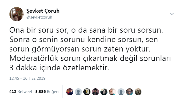 “Ona bir soru sor, o da sana bir soru sorsun. Sonra o senin sorunu kendine sorsun, sen sorun görmüyorsan sorun zaten yoktur. Moderatörlük sorun çıkartmak değil sorunları 3 dakika içinde özetlemektir.”