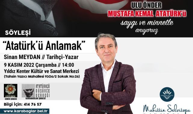 Karabağlar Belediyesi, Ulu Önder Mustafa Kemal Atatürk'ü ölüm yıldönümünde, Tarihçi Yazar Sinan Meydan'ın katılacağı“Atatürk'ü Anlamak” başlıklı söyleşiyle anacak. Eğit-Der İzmir Şubesi ve Atatürkçü Düşünce Derneği Karabağlar Şubesi'yle birlikte düzenlenen etkinlik, 9 Kasım Çarşamba günü saat 14.00'te, Yıldız Kenter Kültür ve Sanat Merkezi (YKSM) Konferans Salonu'nda gerçekleştirilecek.