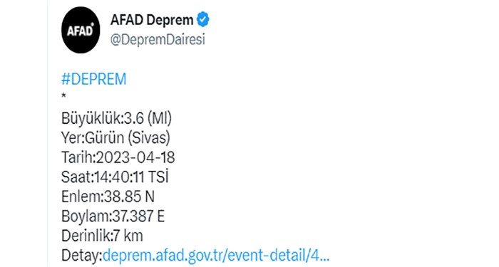 Gündem Yayınlanma: 18 Nisan 2023 - 15:43 Güncelleme: 18 Nisan 2023 - 16:33 Sivas'ta korkutan deprem! Sivas’ın Gürün ilçesinde 3.6 büyüklüğünde deprem meydana geldi. Gündem 18 Nisan 2023 - 15:43 Güncelleme: 18 Nisan 2023 - 16:33 Yorumlar Yazdır A Büyüt A Küçült Yorumlar Sivas'ın Gürün ilçesinde saat 14.40'ta meydana gelen deprem kısa süreli panik oluşturdu. AFAD'ın sosyal medya hesabından yaptığı paylaşıma göre 3.6 büyüklüğündeki depremin yerin 7 kilometre derinliğinde meydana geldiği açıklandı. # sivas# afad# deprem# 3# 6 YORUMLAR adlı kullanıcıya cevap x Gönder İlginizi Çekebilir Mansur Yavaş hakkında soruşturma izni! Bakan Gürlek: 119 ülkede 2 bin 707 FETÖ'cünün peşindeyiz Bakanlık’tan yemek siparişlerine yönelik yeni düzenleme İzmir'de İZBETON soruşturmasında 9 şüpheli adliyeye sevk edildi Son Haberler AK Parti İzmir’de İl Başkansız toplantı tepki topladı! 15. Uluslararası Alaçatı Ot Festivali’nde gastronomi rekabeti ve... Doğal taşın kalbi İzmir’de atıyor Altay'da tek hedef kaybetmemek MHP lideri Bahçeli: "Ara seçim yok, seçim zamanındadır" Sözleşmeli öğretmenlik sözlü sınav sonuçları açıklandı Sözleşmeli öğretmenlik sözlü sınav sonuçları açıklandı