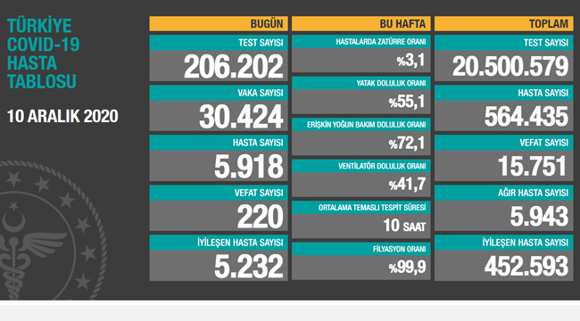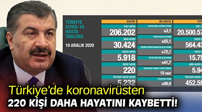 Sağlık Bakanlığı 10 Aralık tarihine ait son 24 saatlik korona virüs tablosunu açıkladı. 30 bin 424 kişiye daha korona virüs tanısı konurken, 220 kişi de hayatını kaybetti.