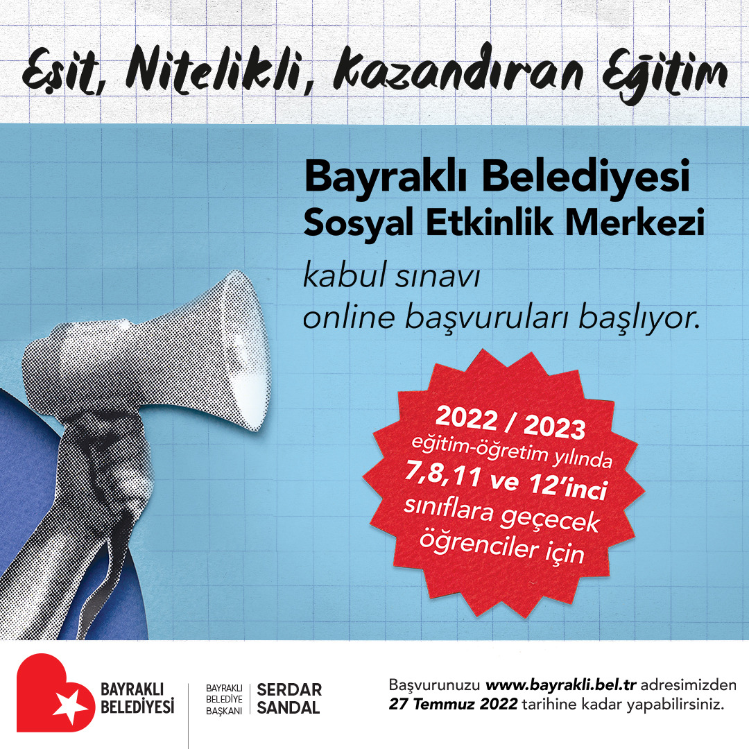 EŞİT, NİTELİKLİ, KAZANDIRAN EĞİTİMBayraklı Belediye Başkanı Serdar Sandal, "’Eşit, nitelikli ve kazandıran eğitim’ sloganıyla bu alanda tüm imkanlarımızı Bayraklı’nın geleceği için seferber ediyoruz. Tek düşüncemiz çocuklarımızı geleceğe en iyi şekilde hazırlamak. Bu kapsamda özel eğitim kurumlarını aratmayan imkanları, eğitim kadrosu ve standartlarıyla çocuklarımıza LGS ve YKS’ye hazırlık kursları veriyoruz. Sınav öncesi olduğu gibi sınav sonrası da öğrencilerimizi yalnız bırakmıyoruz. Önümüzdeki dönemde eğitim almak isteyen tüm öğrencilerimizi sosyal etkinlik merkezine kayıt olmaya davet ediyoruz" diye belirtti.