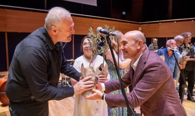 Gecenin sonunda Başkan Soyer sanatçılara zeytin fidanı verdi.