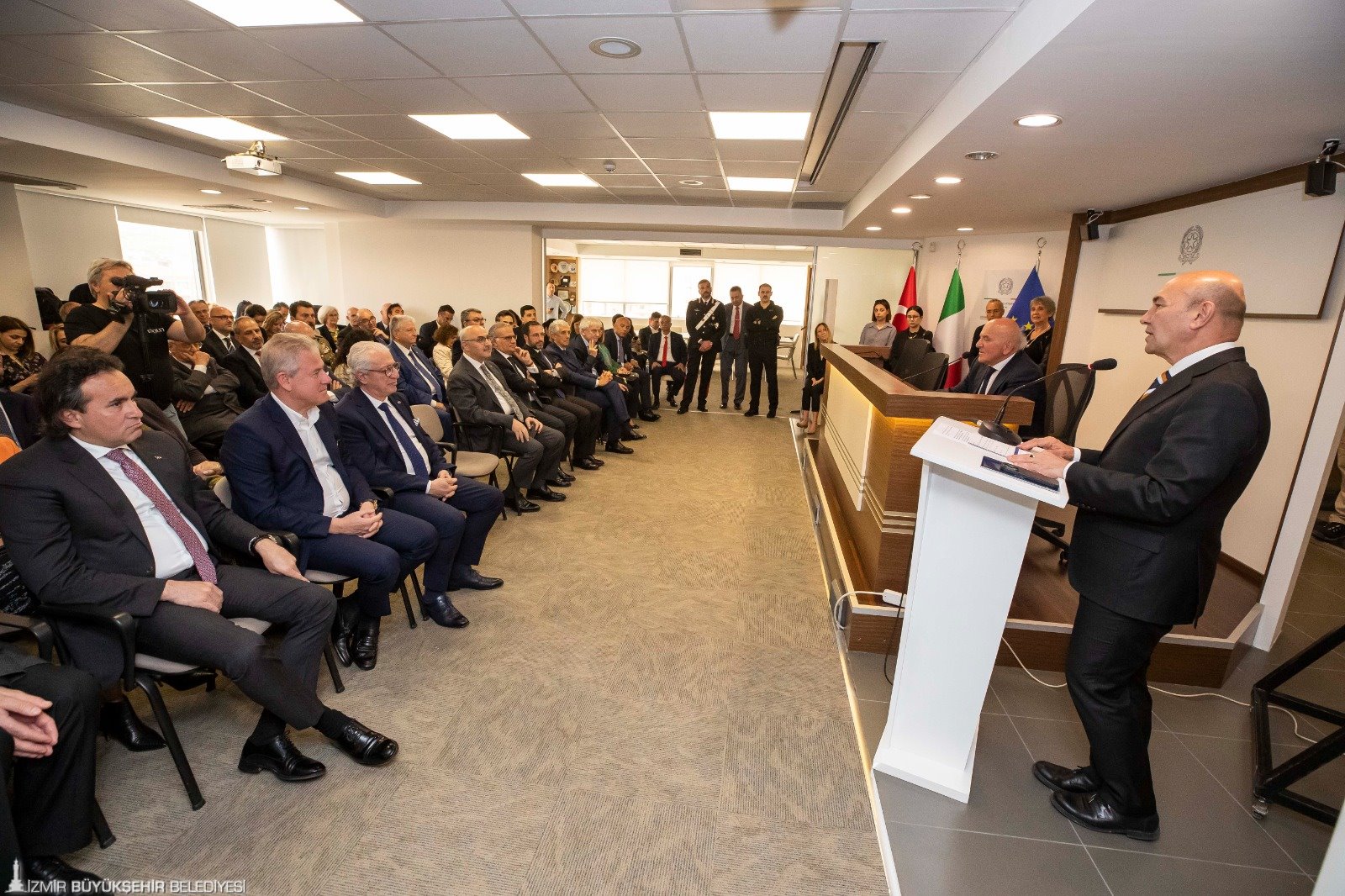 İtalya İzmir arasındaki ilişkiler için İtalya İzmir Konsolosu Valerio Giorgio’ya teşekkür ederek konuşmasına başlayan İzmir Büyükşehir Belediye Başkanı Tunç Soyer, “Dünya bir yandan globalleşirken aslında bir yandan da yerelleşiyor. Hatta buna dair güzel bir sözcük de var; glokalizasyon. Örneğin küresel iklim krizi, küresel ısınma, tüm küresel krizlerin çözümü yerelde. Devletler arası ilişkilerin sağlığı kadar yerelde kurulan insanlar arası ilişkiler de barış için çok önemli. İtalyan konsolosluğunun çalışmalarını çok önemsiyoruz ve değer veriyoruz. İzmir’deki konsolosluklar içinde meslek memurlarının görevlendirildiği 4 konsolosluktan birinin İtalya'ya ait olduğunun altını çizmek istiyorum. Bu İtalya'nın da İzmir’e verdiği önemin göstergesidir. Yeni binanın açılması bu önemin arttığını gösteriyor. Özellikle İzmir’in, Türkiye’nin potansiyelinden hep bahsedilir, potansiyel enerji bir işe yaramaz. Bunu kinetik enerjiye dönüştürmek gerekir. Bu yeni binanın potansiyel enerjiyi kinetik enerjiye dönüştürme konusunda da önemli bir adım olduğunu düşünüyorum” dedi.