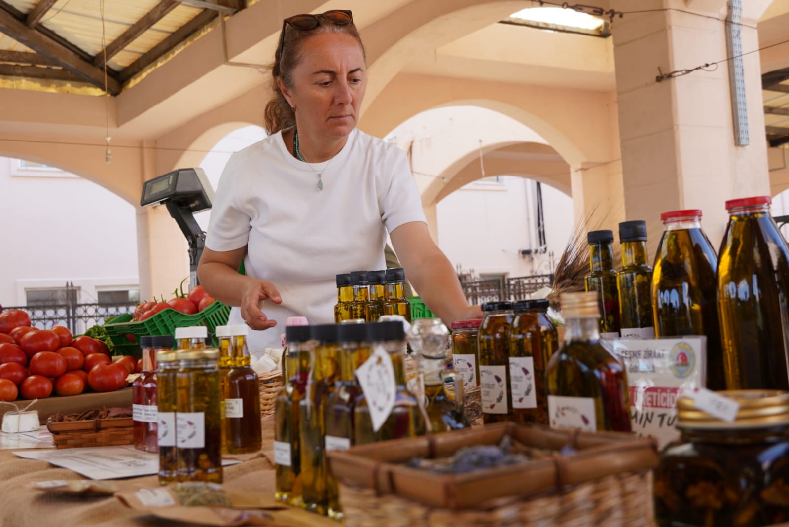 Çeşmeli üreticiler organik ürünlerini Çeşmeliler ile buluşturuyor. Taze meyve ve sebzelerin, geleneksel yöntemlerle üretilmiş tarhana, erişte, köy ekmeği, ev salçası, zeytinyağı, doğal bal, pekmez ve birbirinden lezzetli yöresel tatların zenginleştireceği Çeşme Üretici Pazarı, üreticiden aracısız alışveriş yapma imkanı sunduğu ziyaretçilerine de önemli bir ekonomik avantaj sunacak.
