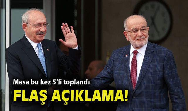İYİ Parti Genel Başkanı Meral Akşener'in masadan kalkmasının ardından 6'lı masadan bu kez 5'li olarak toplandı. Saadet Partisi ev sahipliğinde gerçekleşen toplantı 4,5 saat sürdü. Toplantıdan sonra ise ortak açıklama yapıldı.