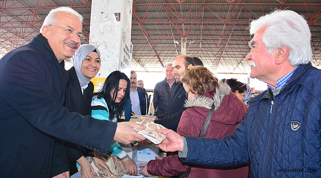 Yaşar Görmez, eşi Arzu Görmez ile birlikte çarşıdaki vatandaşlara bez torba