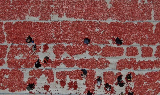 Torbalı’daki 50 bin dönümlük arazide bin işçinin çalıştığı ve domatesleri kavurucu sıcağın altına serdiği öğrenilirken, kuruyan domatesler işlenmek üzere ilçedeki fabrikalara yönlendiriliyor.