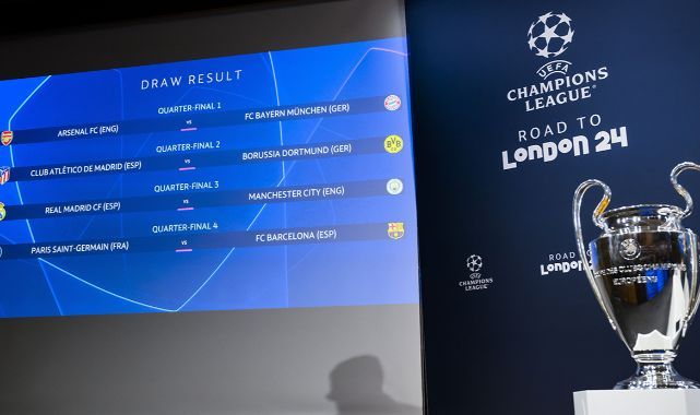 Avrupa’nın kulüp düzeyindeki 1 numaralı organizasyonu UEFA Şampiyonlar Ligi’nde çeyrek final ve yarı final eşleşmeleri belli oldu. İsviçre’nin Nyon kentindeki UEFA Genel Merkezi’nde yapılan kura çekimine son 16 turunda rakiplerini saf dışı bırakan Arsenal, Atletico Madrid, Barcelona, Bayern Münih, Borussia Dortmund, Manchester City, Real Madrid ve Paris Saint-Germain katıldı. Seri başı takımın olmadığı kura çekimini bir dönem Trabzonspor forması da giyen Nijeryalı eski futbolcu John Obi Mikel gerçekleştirdi.Organizasyonda çeyrek final ilk maçları 9-10 Nisan tarihlerinde, rövanş müsabakaları ise 16-17 Nisan tarihlerinde oynanacak.Yarı finallerde ilk karşılaşmalar 30 Nisan-1 Mayıs, ikinci maçlar da 7-8 Mayıs tarihlerinde yapılacak. Yarı final maç programı, çeyrek final rövanş maçlarının ardından 18 Nisan’da açıklanacak.UEFA Şampiyonlar Ligi 2023-2024 sezonunun finali, 1 Haziran Cumartesi günü İngiltere’nin başkenti Londra’daki Wembley Stadı’nda yapılacak.UEFA Şampiyonlar Ligi’nde çeyrek final eşleşmeleri şöyle:Arsenal (İngiltere) - Bayern Münih (Almanya)Atletico Madrid (İspanya) - Borussia Dortmund (Almanya)Real Madrid (İspanya) - Manchester City (İngiltere)Paris Saint-Germain (Fransa) - Barcelona (İspanya)UEFA Şampiyonlar Ligi’nde yarı final eşleşmeleri ise şu şekilde:Atletico Madrid - Borussia Dortmund / Paris Saint-Germain - BarcelonaArsenal - Bayern Münih / Real Madrid - Manchester City