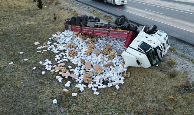 Öte yandan, devrilen tır ve un çuvalları ise dron ile görüntülendi.