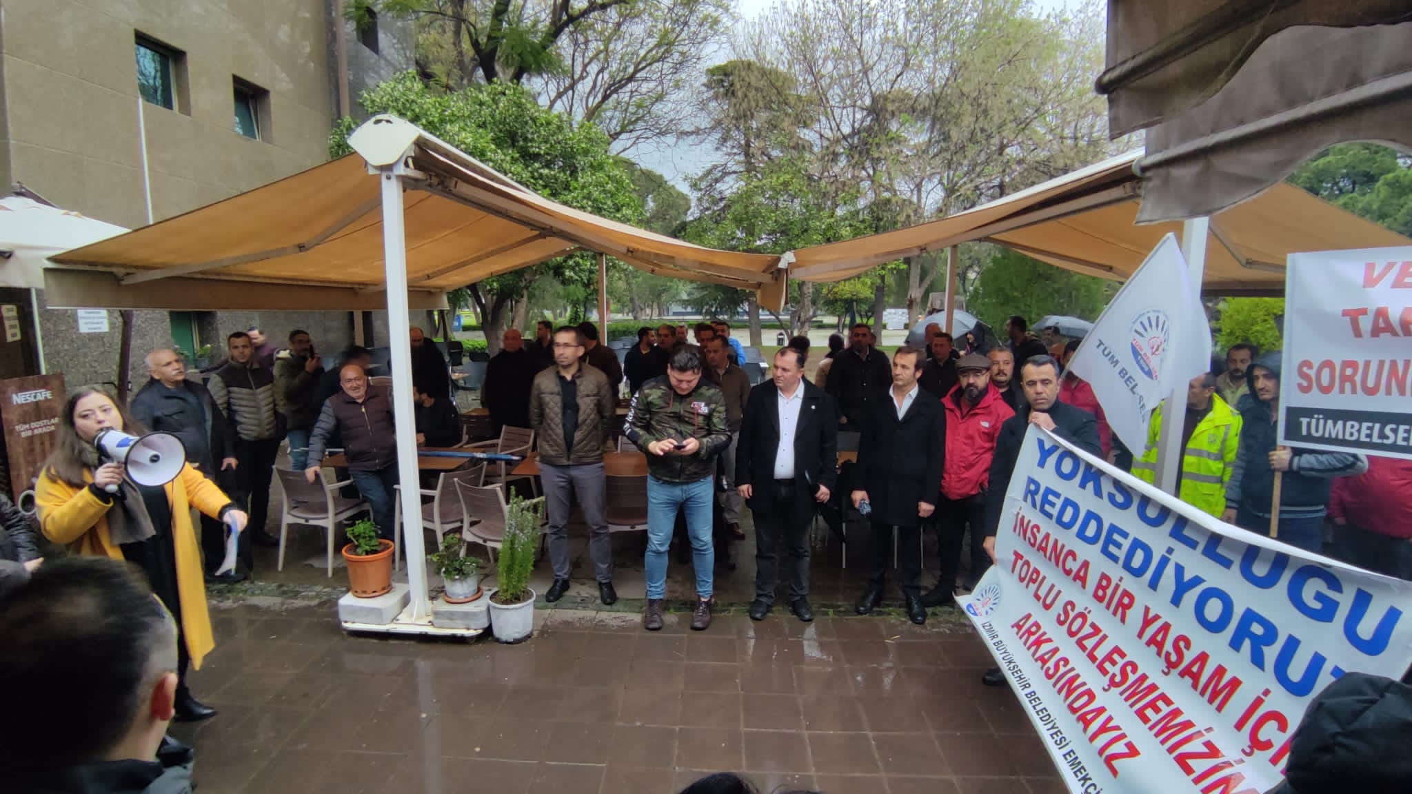 Çiğdem CANPOLAT / ÖNCÜŞEHİR - İzmir Büyükşehir Belediyesi ve Tüm Belediye ve Yerel Yönetim Hizmetleri Emekçileri Sendikası (TÜM BEL-SEN) İzmir 1 Nolu Şubesi arasında yapılan ve bugün 4'ncüsü düzenlenen toplu iş sözleşmesi (TİS) görüşmeleri başladı. Otobüs, itfaiye, mezarlıklar ve İZSU'da görev alan yaklaşık olarak 7 bin personeli ilgilendiren toplu iş sözleşmesi sürecinde bugün Kültürpark içerisinde yer alan İzmir Sanat’ta bir araya gelen emekçiler pankartlarda birlikte 4’ncü TİS görüşmesinin yapılacağı salona doğru yürüdü.
