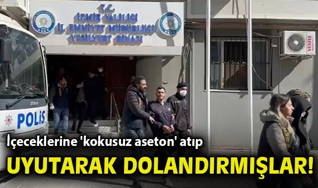 Yeşilçam filmleri İzmir'de gerçek olduYapılan çalışmalarda, çete üyelerinin iş yerlerine gelen müşterileri içeceklerine 'kokusuz aseton' atarak sersemlettikleri ve kredi kartlarından binlerce lira çekerek dolandırdıkları belirlendi. Dolandırılan vatandaşların daha sonra kendilerine ulaşarak paralarını geri istediği, şüphelilerin de kendilerini oyaladıkları mesajlaşmalar ortaya çıktı.